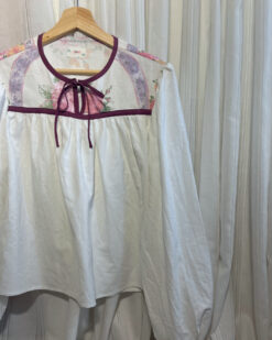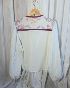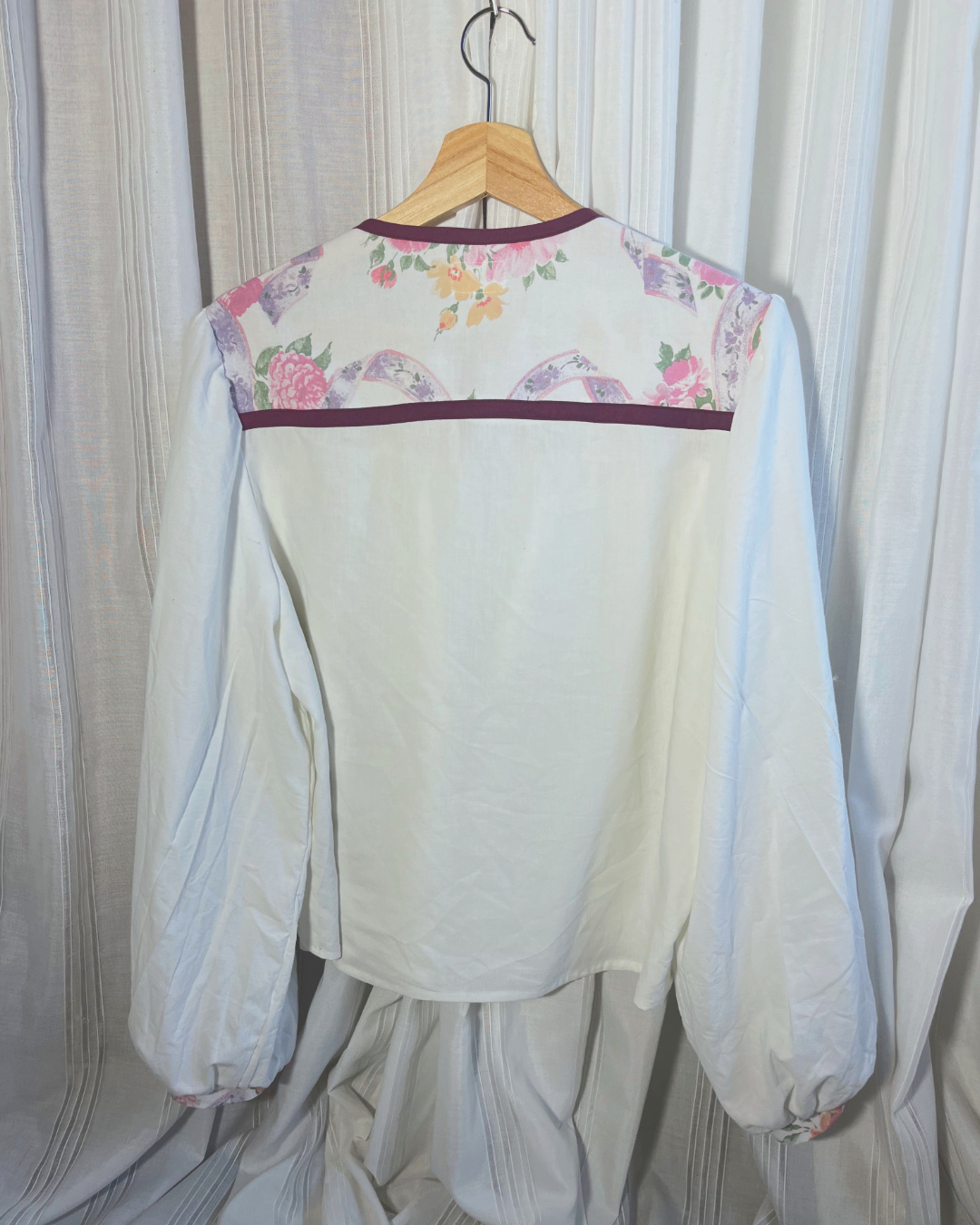 Blouse met biaisband en strik, in wit en bloemen print gemaakt van vintage katoenen textiel.