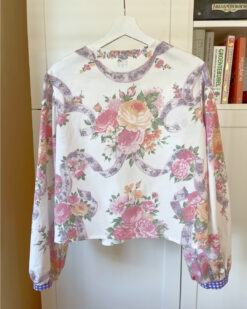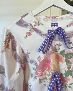 Blouse met striksluiting met roze bloemen gemaakt van vintage katoenen textiel.