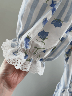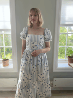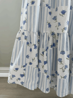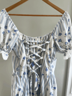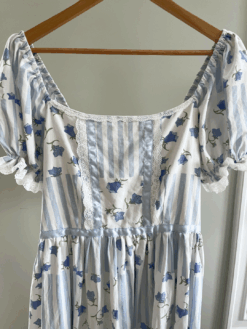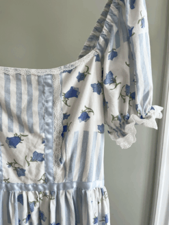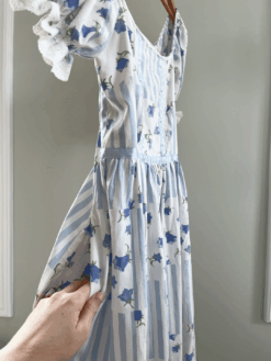 Droom weg in deze romantische, handgemaakte jurk geïnspireerd op de iconische Gunne Sax stijl. Met een tijdloos blauw-wit patroon van strepen en bloemen. Gemaakt van 100% gerecycled katoen, is deze jurk niet alleen stijlvol, maar ook vriendelijk voor de planeet. De zachte katoenen stof is licht en ademend, perfect voor zomerse dagen, maar ook ideaal gelaagd in koudere seizoenen.
