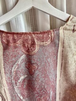 Een vintage inspired blouse jacket met lange (ballon)mouwen van vintage katoenen gordijnen. De blouse jacket heeft strikjes aan de voorkant. Het patroon is zo genaaid dat het symmetrisch lijkt. Er is gekozen voor een rood stiksel om het geheel wat meer contrast te geven. De vintage inspired blouse jacket past het best met een maat 38. Als je twijfelt of dit de goede maat voor jou is, neem dan even contact op: stuur een mail naar evelien@faev.nl of stuur een berichtje via Instagram.